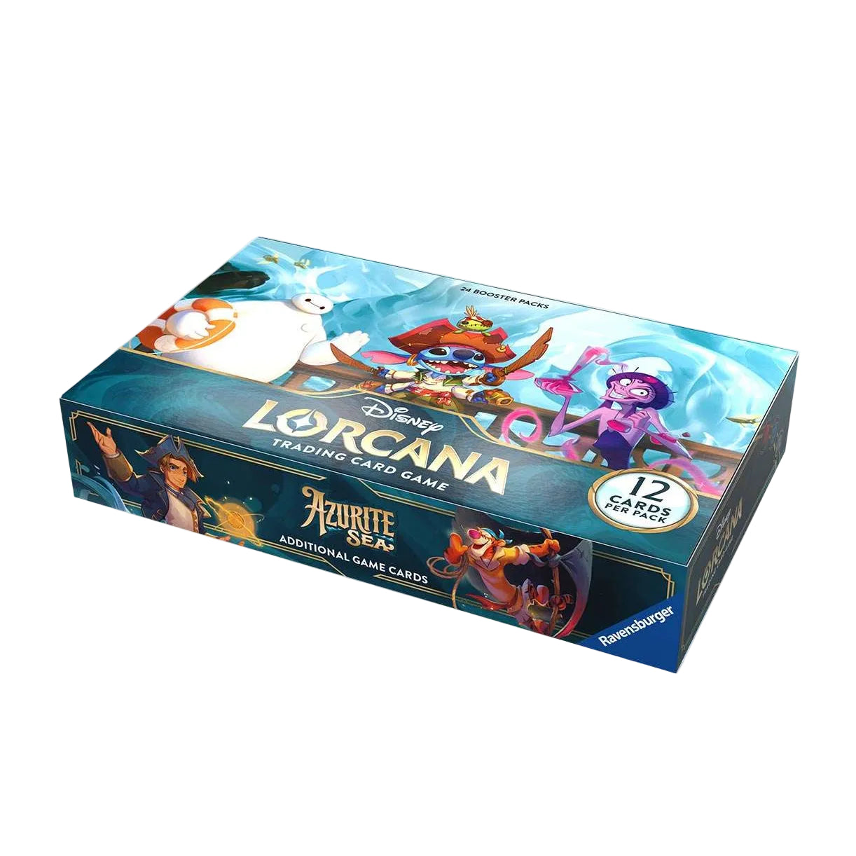 Booster display med 24 boosterpakker fra Lorcana: Azurite Sea-utvidelsen. Hver pakke har 12 kort, hvorav 6 er common, 3 er uncommon, 2 er rare, super rare eller legendary, og et foil-kort med tilfeldig sjeldenhet.